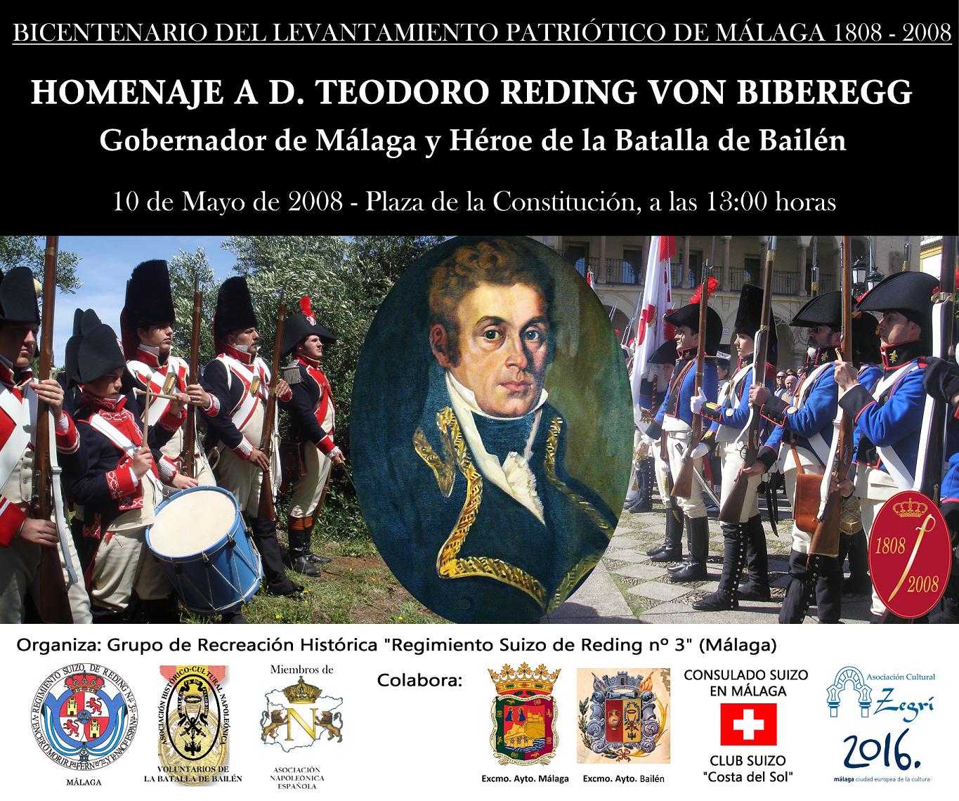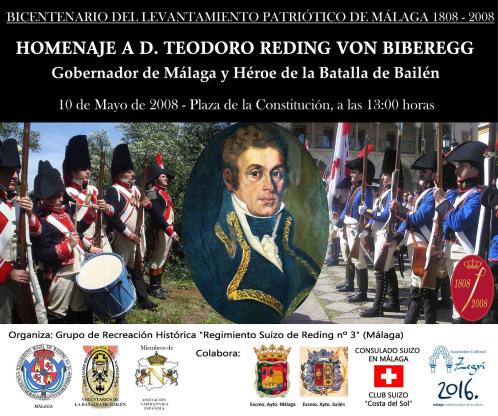 – Homenaje a Reding, los Rgtos. de Infantería de Línea presentes en Málaga en 1808 (Rgto. Suizo de Reding nº 3 y Reyna) y los Voluntarios malagueños, que siguieron fielmente a su General y Gobernador hasta los campos de Bailén. Homenaje a los suizos sacrificados por España y Agradecimiento a la Nación Suiza.