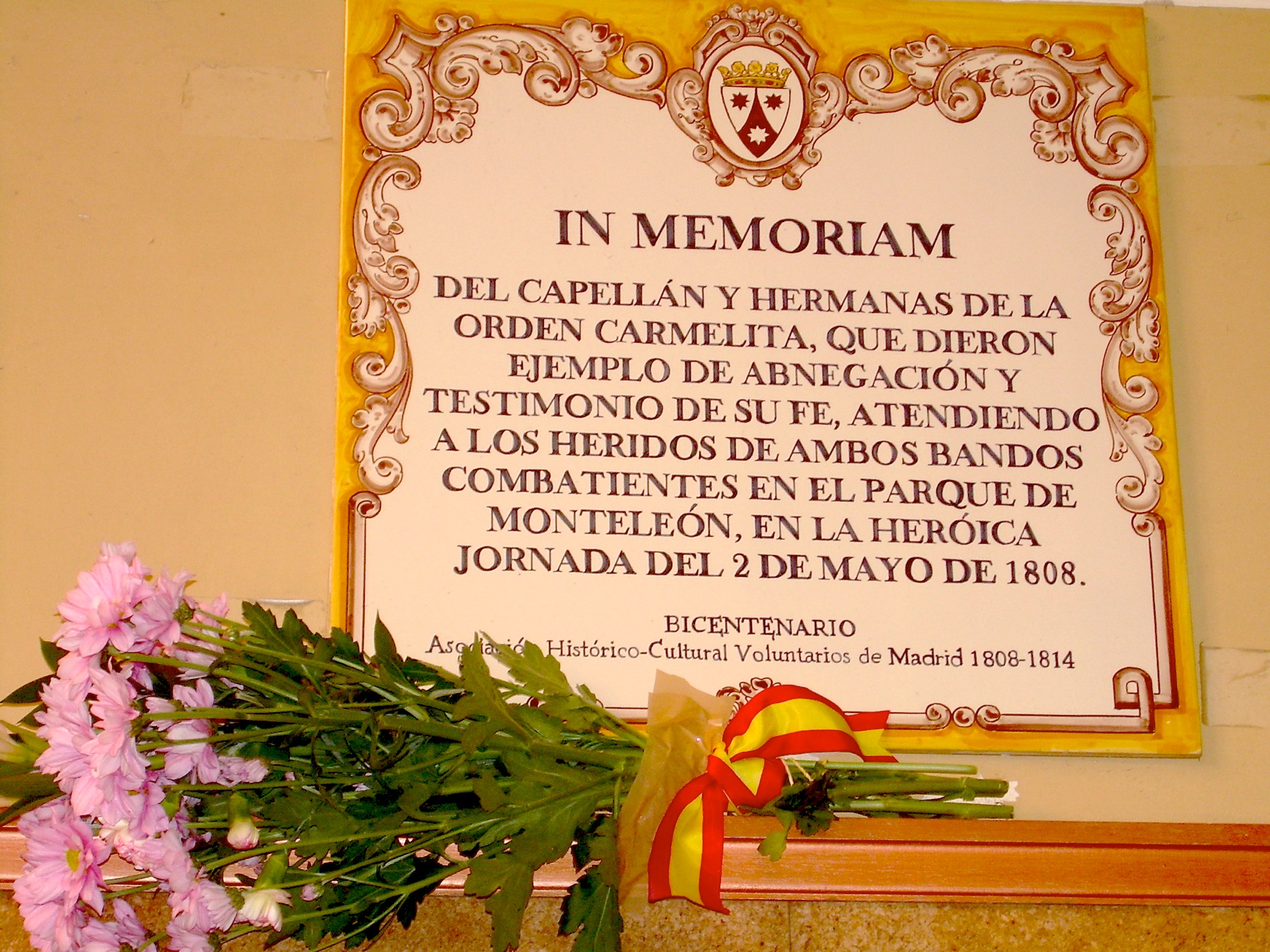 Previamente a la Recreación Histórica, los miembros de la asociación participaron en un pequeño pero sentido homenaje al “Capellán y Hermanas de la Orden Carmelita, que dieron ejemplo de abnegación y testimonio de su fe, atendiendo a los heridos de ambos bandos combatientes en el Parque de Monteleón, en la heroica jornada del 2 de Mayo de 1808”, como queda recogido en la placa que “Voluntarios de Madrid” inauguró en la entrada de la, actualmente, iglesia, el año pasado.