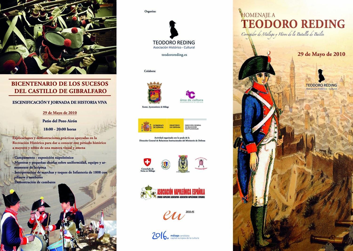 El día 29 de Mayo, de la mano de la Asociación Histórico – Cultural “Teodoro Reding”, por tercer año consecutivo Málaga volverá a recordar a sus héroes de 1808, los miles de voluntarios malagueños que junto a su Gobernador Militar y Corregidor, el General Teodoro Reding, contribuyeron valientemente a la primera victoria sobre las tropas napoleónicas en Bailén.