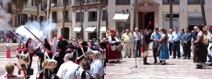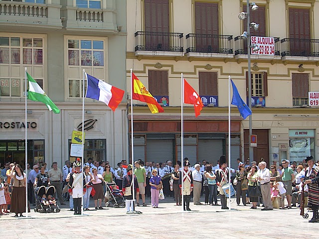 Posteriormente, los participantes llegaron a la Plaza de la Constitución donde fueron recibidos por un numeroso público que ya los seguía desde el Paseo y la calle Larios. El ya tradicional acto, con presencia del Delegado de Cultura del Ayuntamiento de Málaga, Miguel Briones, el Subdelegado de Defensa en Málaga, Miguel Ángel Gálvez, y representantes del Cuerpo Consular, dio comienzo con la magnífica introducción del periodista Antonio Quero.