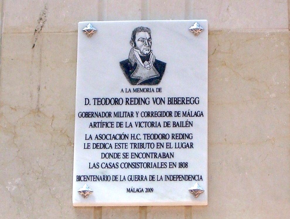 A continuación, glosó la figura de Teodoro Reding y su labor en la ciudad, destacando el intento de paliar las epidemias de fiebre amarilla que se extendieron en Málaga en 1803 y 1804 como miembro de la Junta de Sanidad, así como sus reformas en materia sanitaria, social, política, económica, urbanística y hasta ornamental. Un aporte curioso, que se distribuyó al público asistente, fueron algunos párrafos de un documento impreso en Málaga el 28 de Julio de 1808, tras la batalla de Bailén, en el que se decía: