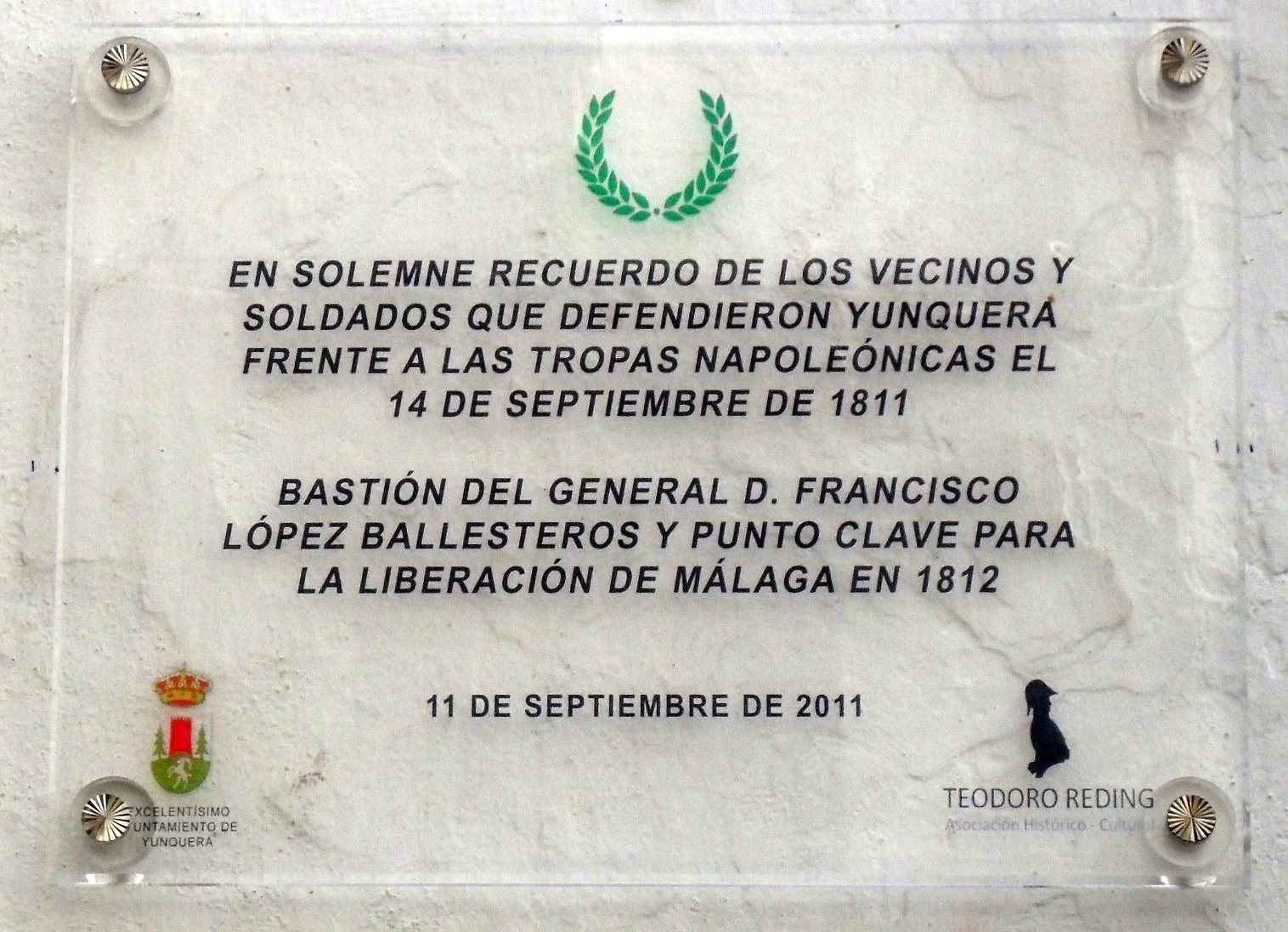 “En solemne recuerdo de los vecinos y soldados que defendieron Yunquera frente a las tropas napoleónicas el 14 de Septiembre de 1811.