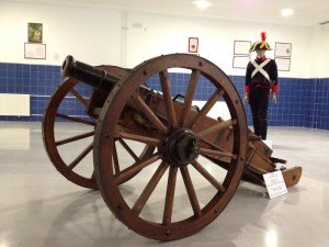El cañón reconstruido por Juan Valera Morales, junto al uniforme de la Compañía Fixa de Real Artillería de Málaga