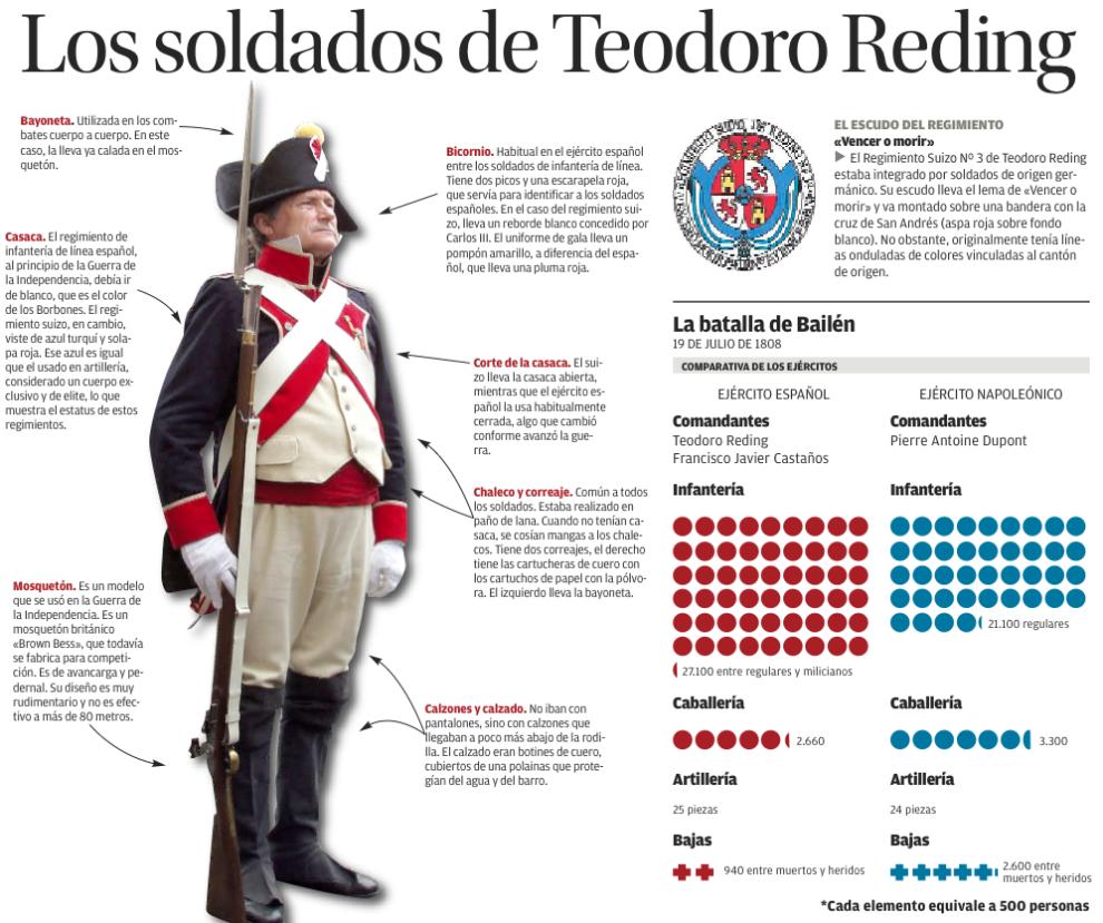 El periodista Alfonso Vázquez exponía su brillante trayectoria, su recuerdo en Málaga a través de la asociación y entrevistaba a la familia malagueña que aún lleva orgullosamente su apellido. Con el título «El general suizo que venció a las tropas de Napoleón», también recordaba la batalla de Bailén, de cuya victoria es hoy es reconocido artífice, publicando también un gráfico de la misma con las fuerzas contendientes, las fases inicial y final, y el uniforme y equipo de un soldado del Regimiento Suizo de Reding nº 3 (1808) sobre la fotografía de uno de los recreadores veteranos de la asociación, Juan Valera Morales.